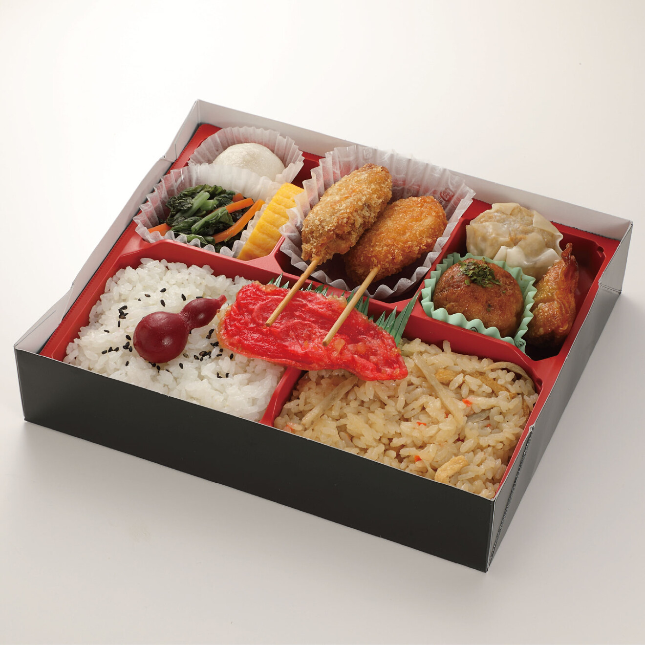 たこ焼き、牛肉の串カツ、紅生姜の天ぷら、かやくご飯など、なにわ(大阪)らしいご当地メニューを盛り込んだご当地弁当。