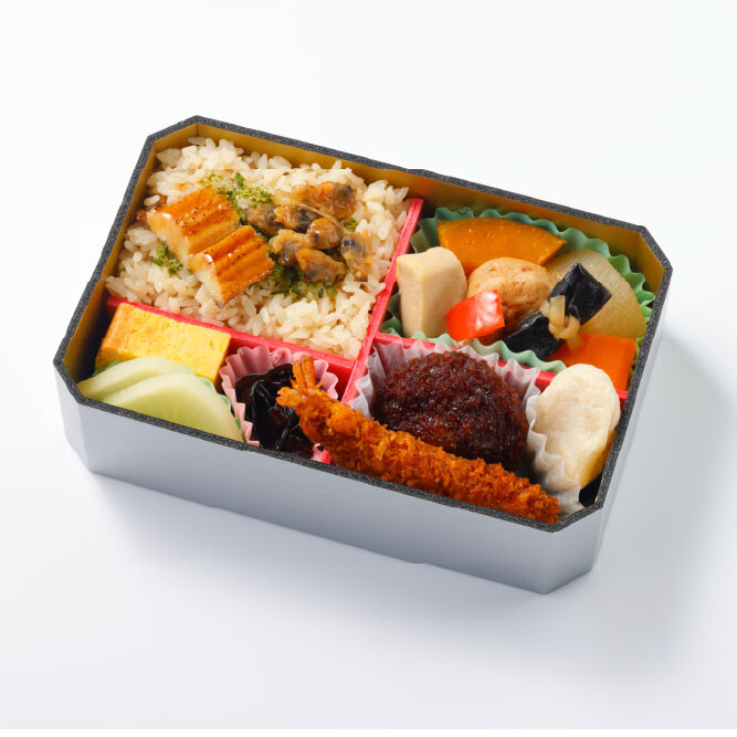 東京江戸前定番の味「深川めし」「穴子蒲焼」から始まり、静岡県産かつおぶし粉入りの薩摩揚、名古屋ご当地食材「みそかつ」など、東海道新幹線沿線のご当地食材と味わいをイメージして盛り付けたお弁当です。