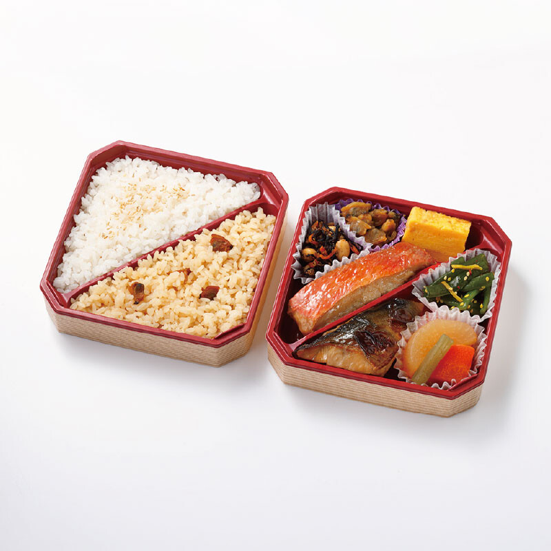 金目鯛の煮付けと縞ホッケのみりん焼を盛りつけ、副菜は、海鮮食材の品目を増やし、魚介好きに好まれる商品にリニューアルしました。