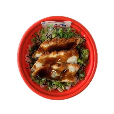 酢飯にうなぎ、きざみのり、ねぎをトッピングし、たれをかけた丼です。お好みで別添のわさびをつけてお召し上がりください。