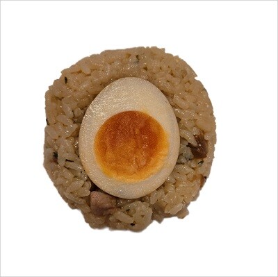 醤油ラーメン風味のご飯に醤油味の茹卵をトッピングした見た目にもインパクトのあるおむすびです。