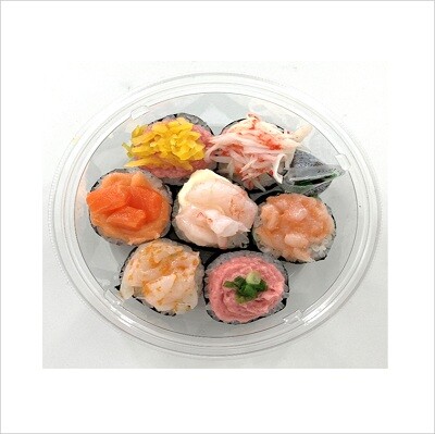 一口サイズの海苔巻きにサーモン、ねぎとろ,いかなどを彩りよくカナッペ風に盛り付けました。