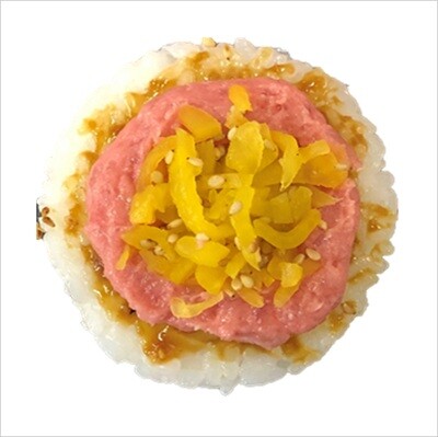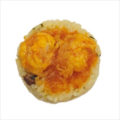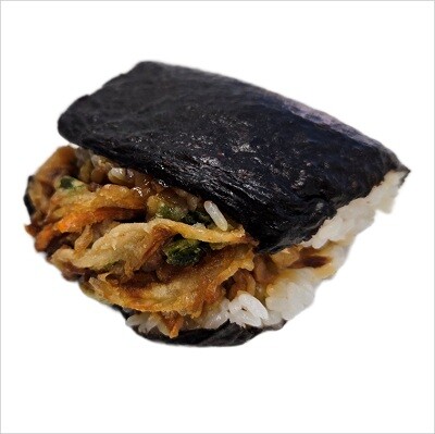 小えび、玉ねぎ、人参、葉大根のかきあげをサンドおむすびにしました。かきあげのたれとの相性も良く、ボリューム感のある製品です。