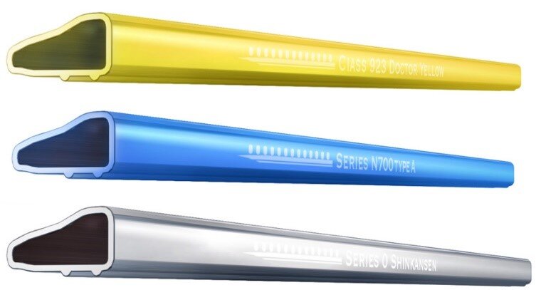 本ストローは、アルミニウムの押出製法で製造しています。カラーは、アルミニウムのカラーアルマイト処理※1を行い、各車体を想起させる色付けをしています。また、UACJ押出加工の精密な押出技術により、飲み口の断面は、新幹線の先頭車両をモチーフとし、車輪も付けくわえることでよりリアリティのある形状を実現しました。