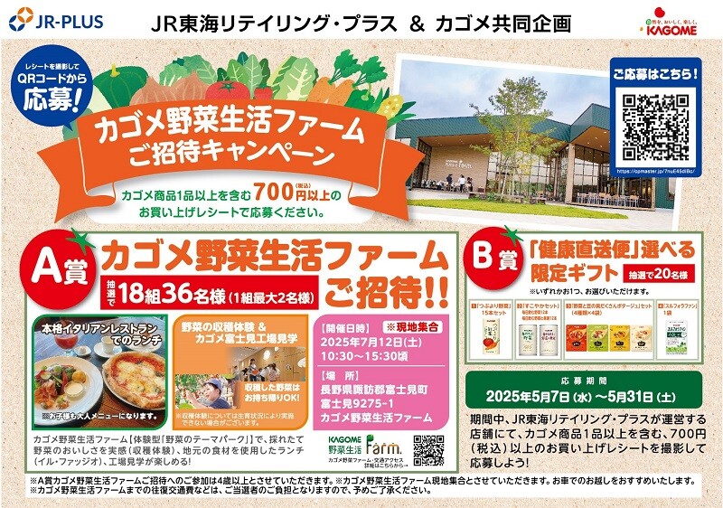 さらに!期間中カゴメ商品を含む税込700円以上のお買い物で「カゴメ野菜生活ファームにご招待キャンペーン」も開催中!カゴメ野菜生活ファームで、野菜の収穫体験・工場見学、本格的なイタリアンレストランでランチが楽しめちゃいます!B賞は「健康直送便」からお好きなギフトが選べちゃう!この機会にぜひ「カゴメ商品」をお楽しみください!