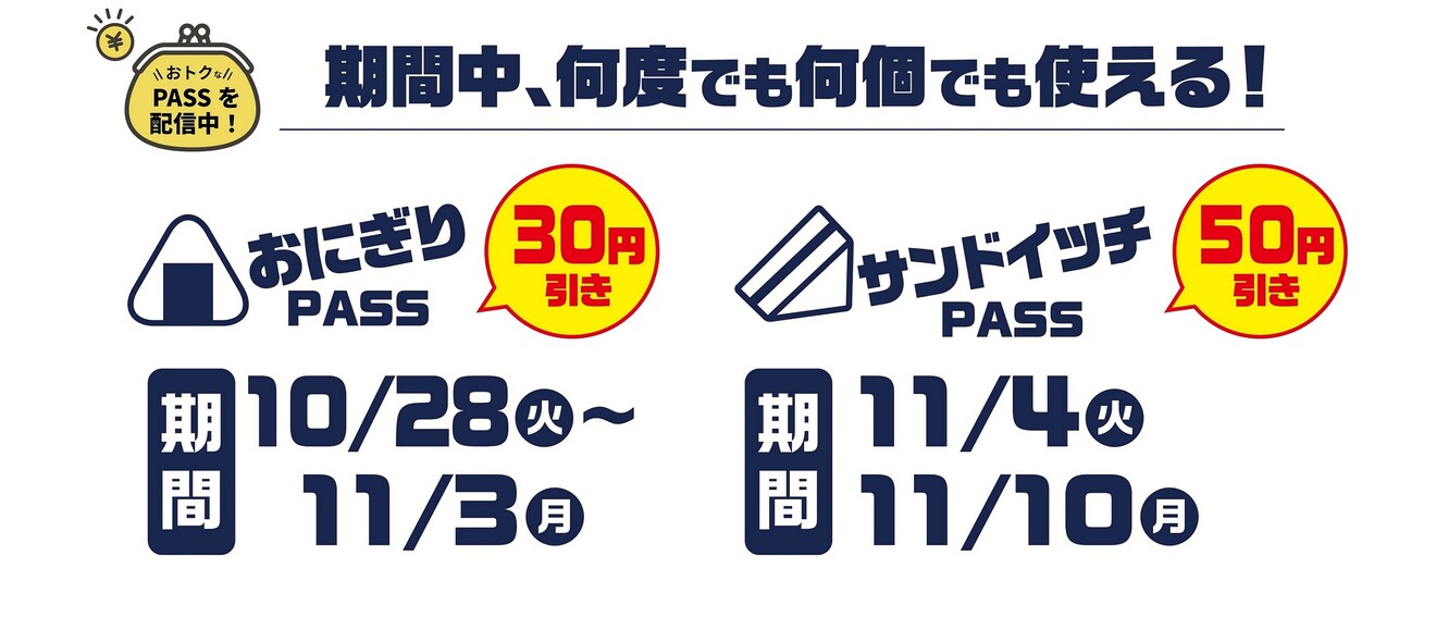 期間中、何回でも何個でも使用できるおトクなパスになっていますので、ぜひJR-PLUSでおにぎり・サンドイッチをお楽しみください。