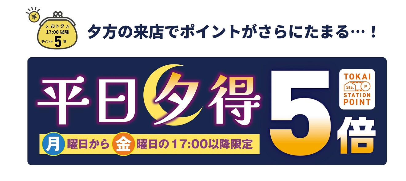②平日の17:00に『TOKAI STATION POINTアプリ』を提示してお買い物いただくと、ポイントが5倍に!