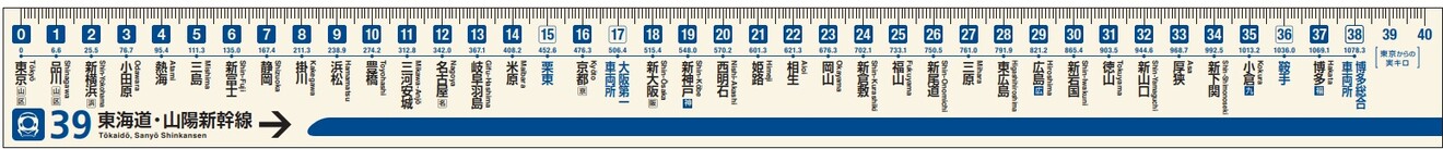 各停車場の上部には東京駅からの実キロ(実際の距離)が記載されております。