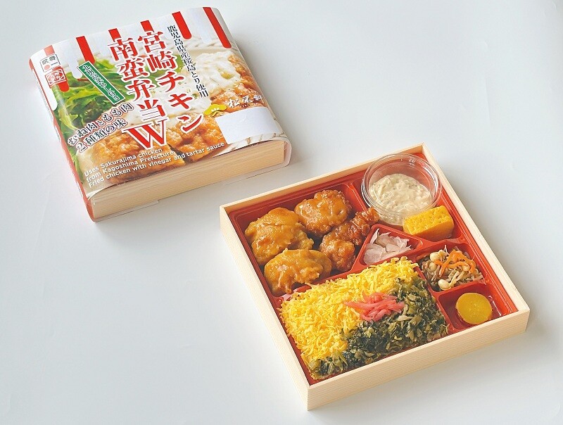 鹿児島銘柄鶏の「桜島とり」のもも肉・むね肉をカラっと揚げた宮崎名物チキン南蛮に九州の高菜をたっぷりご飯にのせたお弁当に仕上げました。