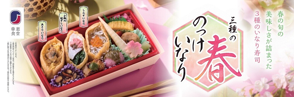 当社は、2026年3月3日(火)にオリジナル駅弁ブランド「車窓食堂」から、お花見などの春の行楽にぴったりな新商品「三種の春のっけいなり」を発売します。春の旬の食材が彩り華やかな、見た目も楽しいいなり寿司のお弁当です。
