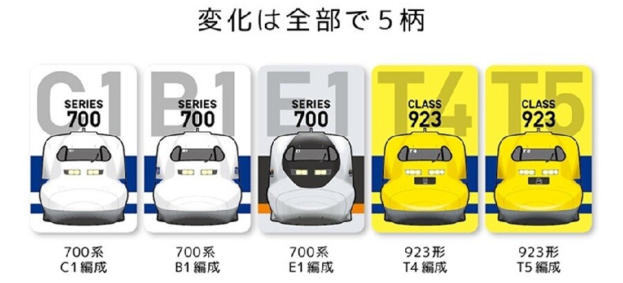 さらに、700系をベースに開発された923形ドクターイエローからは、JR東海所有車両(T4編成)、JR西日本所有車両(T5編成)を組み合わせ、見る角度によって異なる車両が現れる構成としました。