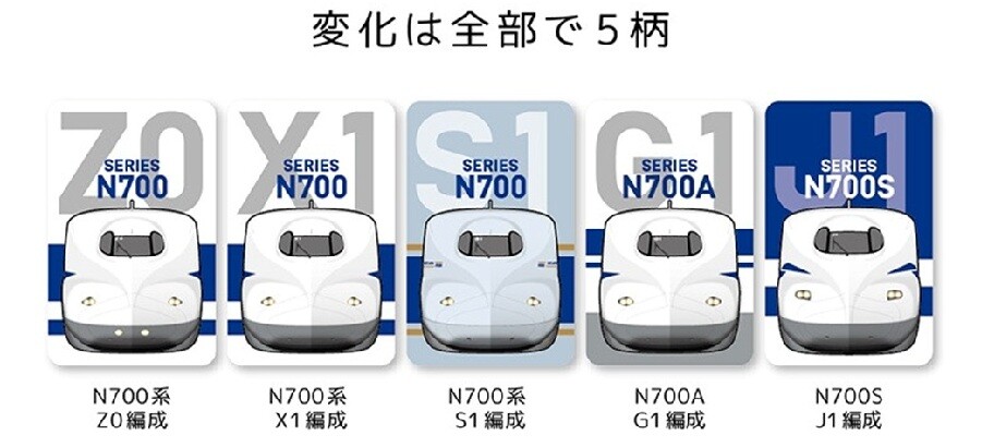 ラインナップは、N700系量産先行試作車(初期のZ0編成)、N700系 typeA(X編成)、JR西日本所有のS編成(みずほ・さくら)とN700A・N700Sです。