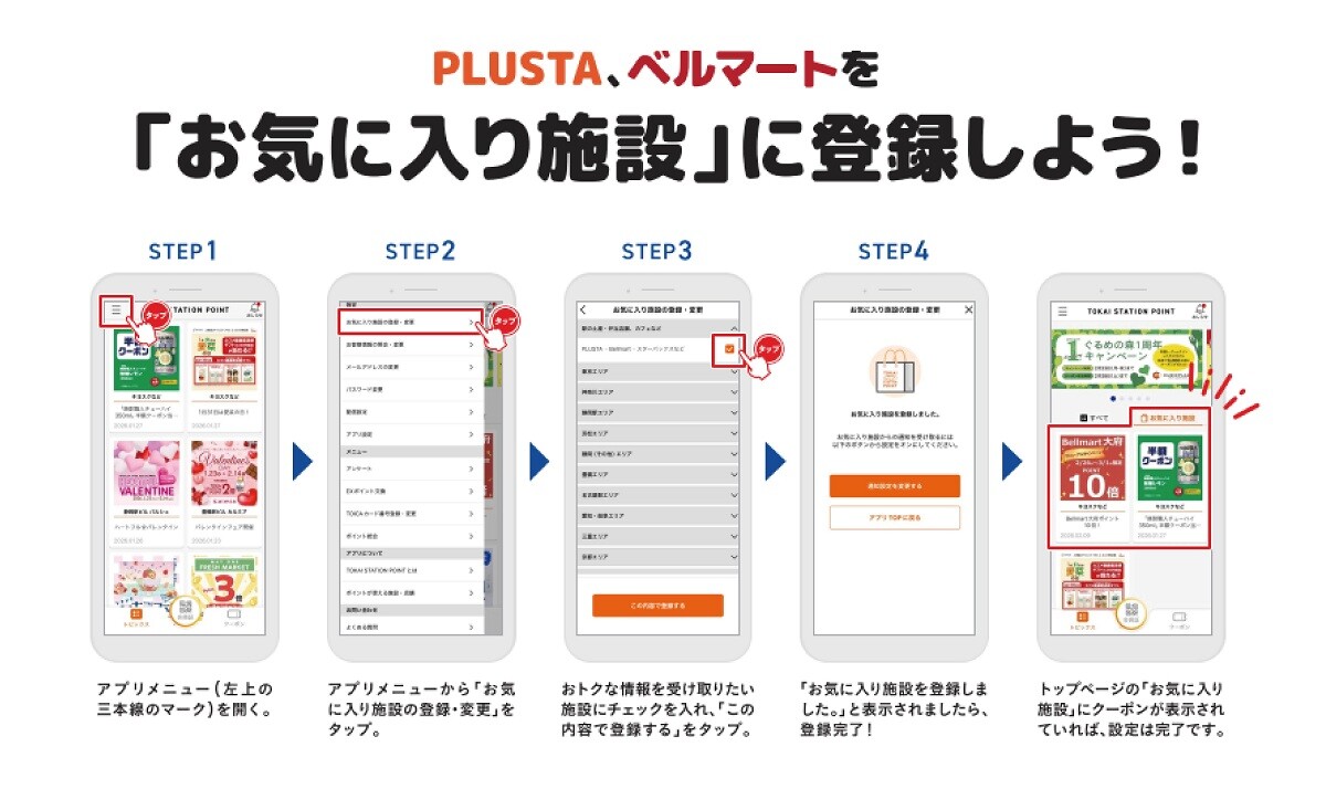 キャンペーン期間中に新規で『TOKAI STATION POINTアプリ』をダウンロードし、「PLUSTA・Bellmart・スターバックスなど」の施設をお気に入り登録した方全員にもれなくTOKAI STATION POINT100ポイントをプレゼントいたします。まだアプリをお持ちでない方は、このお得なチャンスをぜひお見逃しなく!