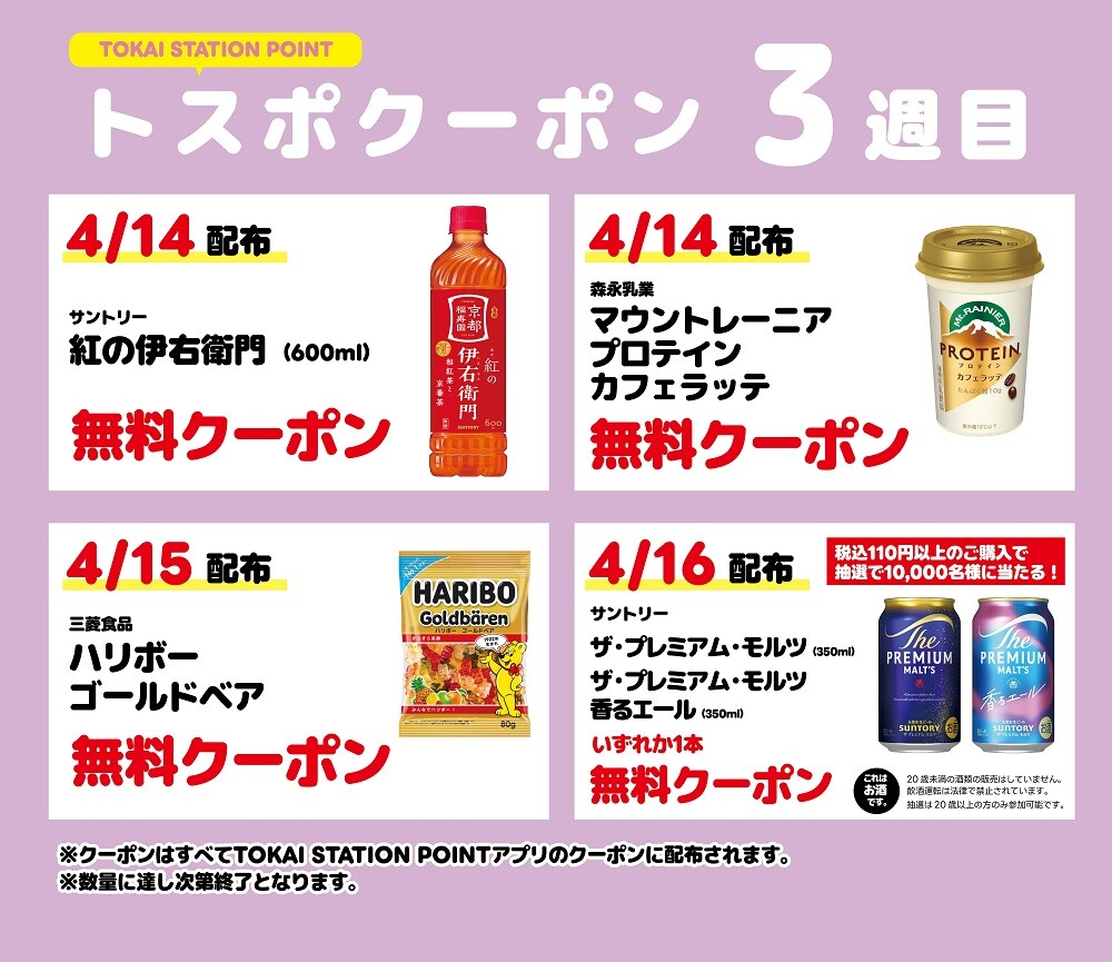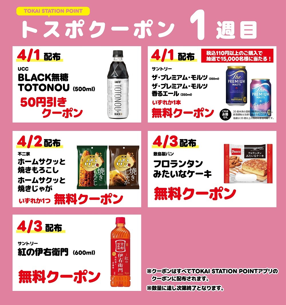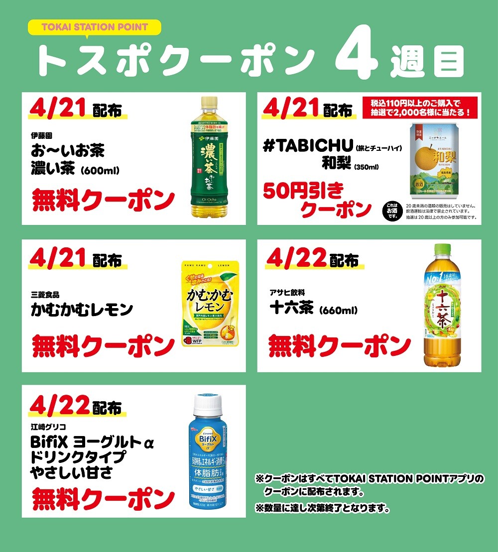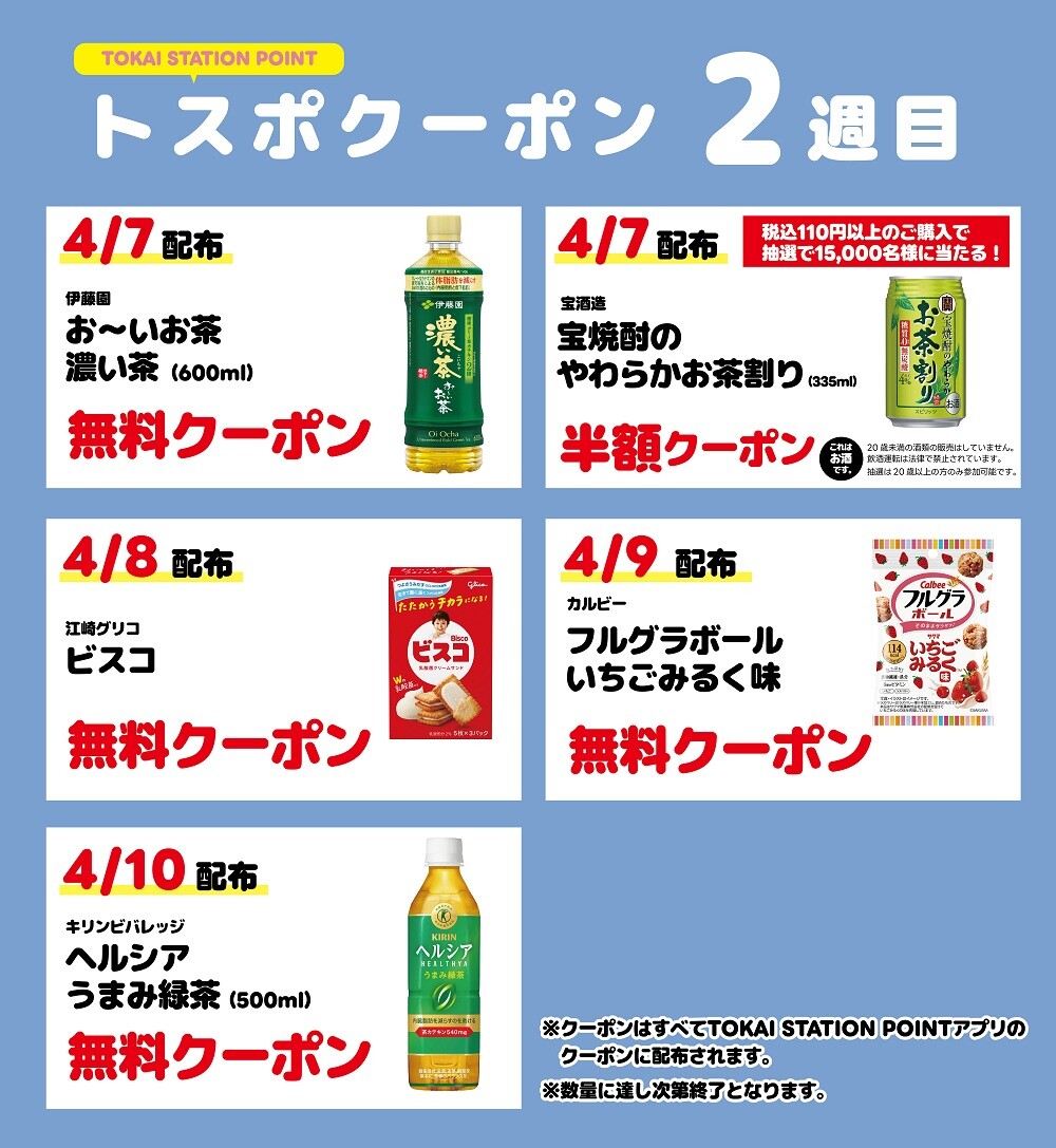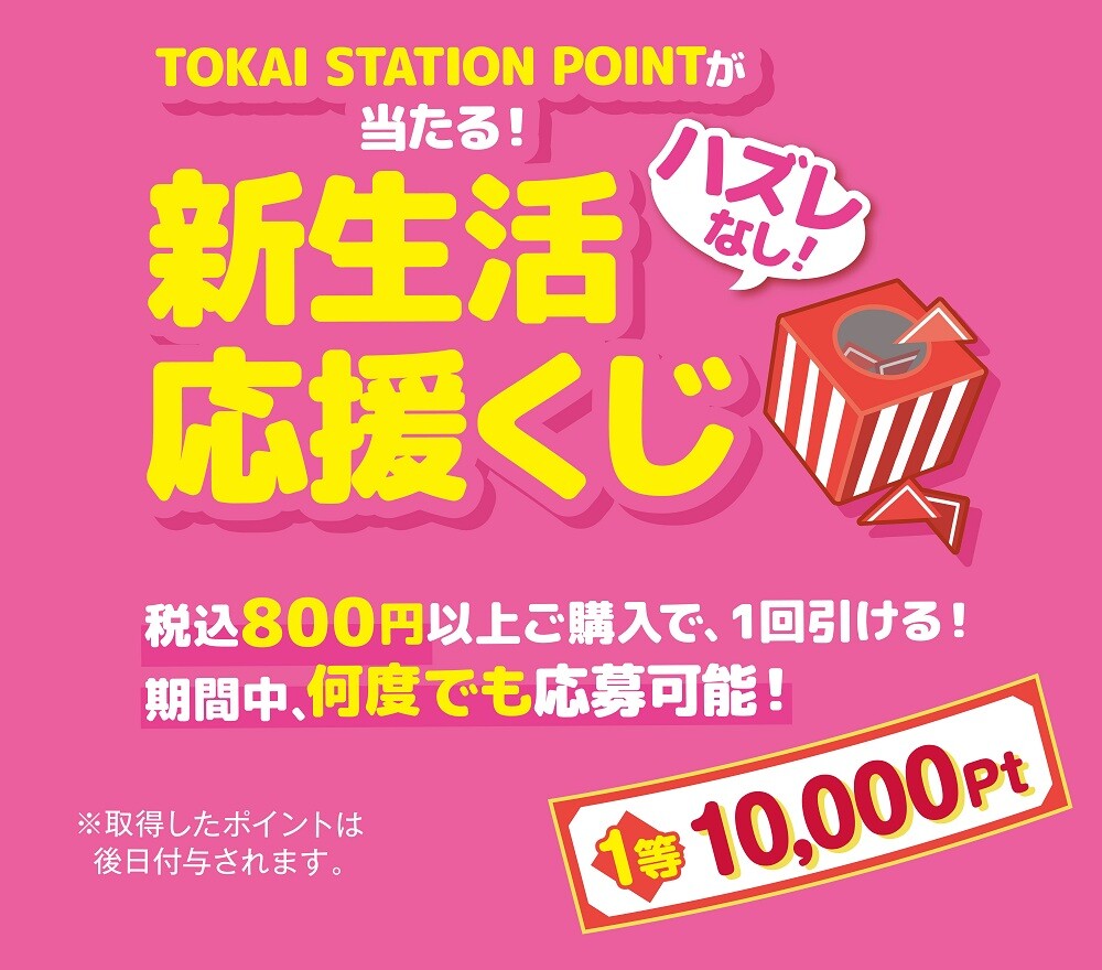 『TOKAI STATION POINTアプリ』を提示して、税込800円以上ご購入いただくと「くじ」が1回引けます。ハズレなしで当たりの出たTOKAI STATION POINTが後日付与されます。
