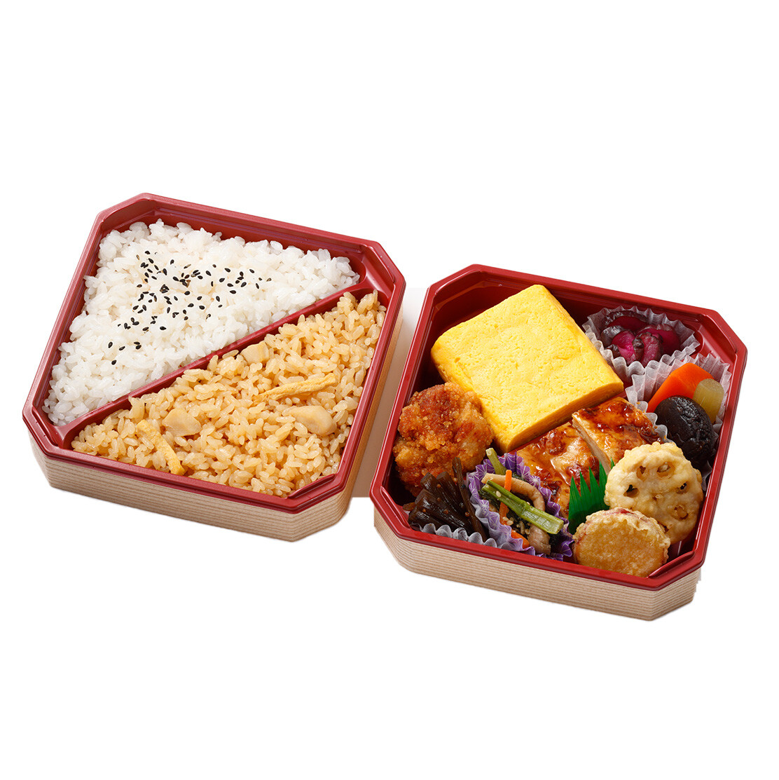 鶏めし、唐揚げ、鶏の照焼、だし巻きたまごをメインに副菜も山をイメージした食材を使用したおかずを組み合わせました。