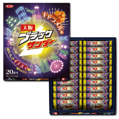 有楽製菓と美十が共同開発をした、ブラックサンダーシリーズの大阪土産商品です。ブラックサンダーにも使用されているザクザクビスケットとココアクッキーに、キャラメルパウダーを練りこんだこってり感のある濃厚なキャラメルチョコレートをコーティング。ブラックサンダーらしさと大阪らしさをお楽しみいただける「コテコテ」な味わいに仕上げました。