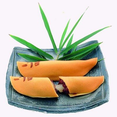 やわらかいカステラ生地で求肥と粒あんを包み、鮎の形に仕上げました。